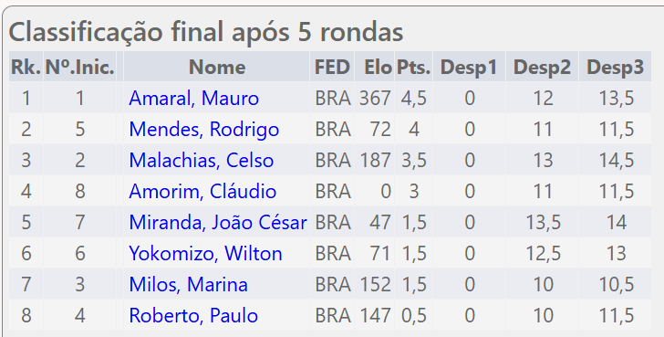 Foram 8 participantes e o torneio foi muito disputado. Acabou vencendo o Mauro Amaral, do Xadrez Total, com 4,5 pontos.