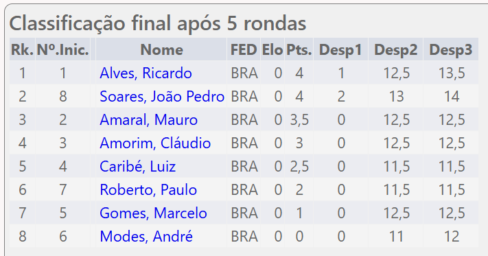 Foi o primeiro torneio do ano, com 8 jogadores. O torneio foi muito concorrido e ficaram empatados na primeira colocação os 2 jogadores mais novos, o Ricardo Alves e o João Pedro Marinelli Soares, sendo que o Ricardo ganhou no critério de desempate, o confronto direto.