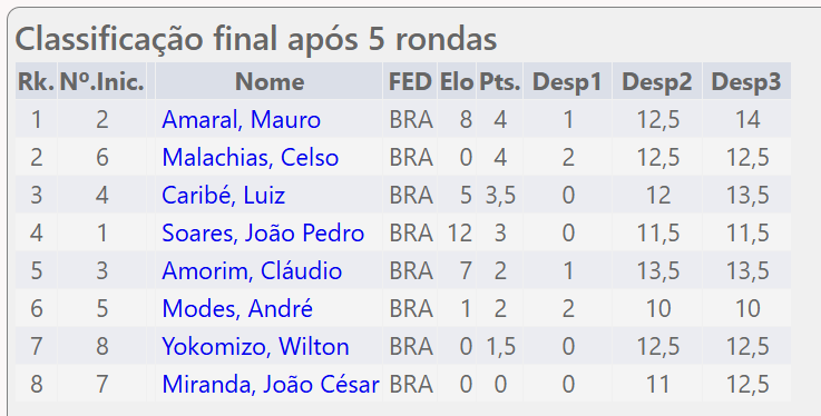 O torneio foi muito disputado até o final, quando o Mauro Amaral ganhou do Celso no critério de desempate: confronto direto.