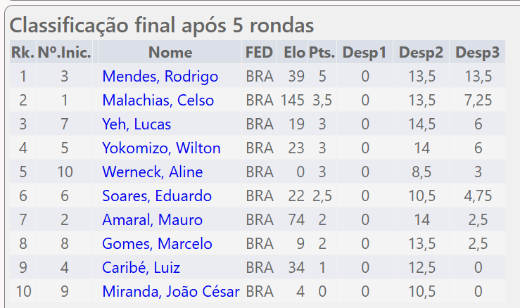 Ontem tivemos 10 participantes incluindo uma jogadora nova, a Aline Werneck. O MN Rodrigo Mendes ganhou de ponta a ponta, com 5 em 5.